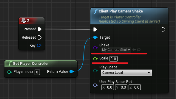 "Get Player Controller"에서 "Client Play Camera Shake"노드를 연결하여 호출합니다.